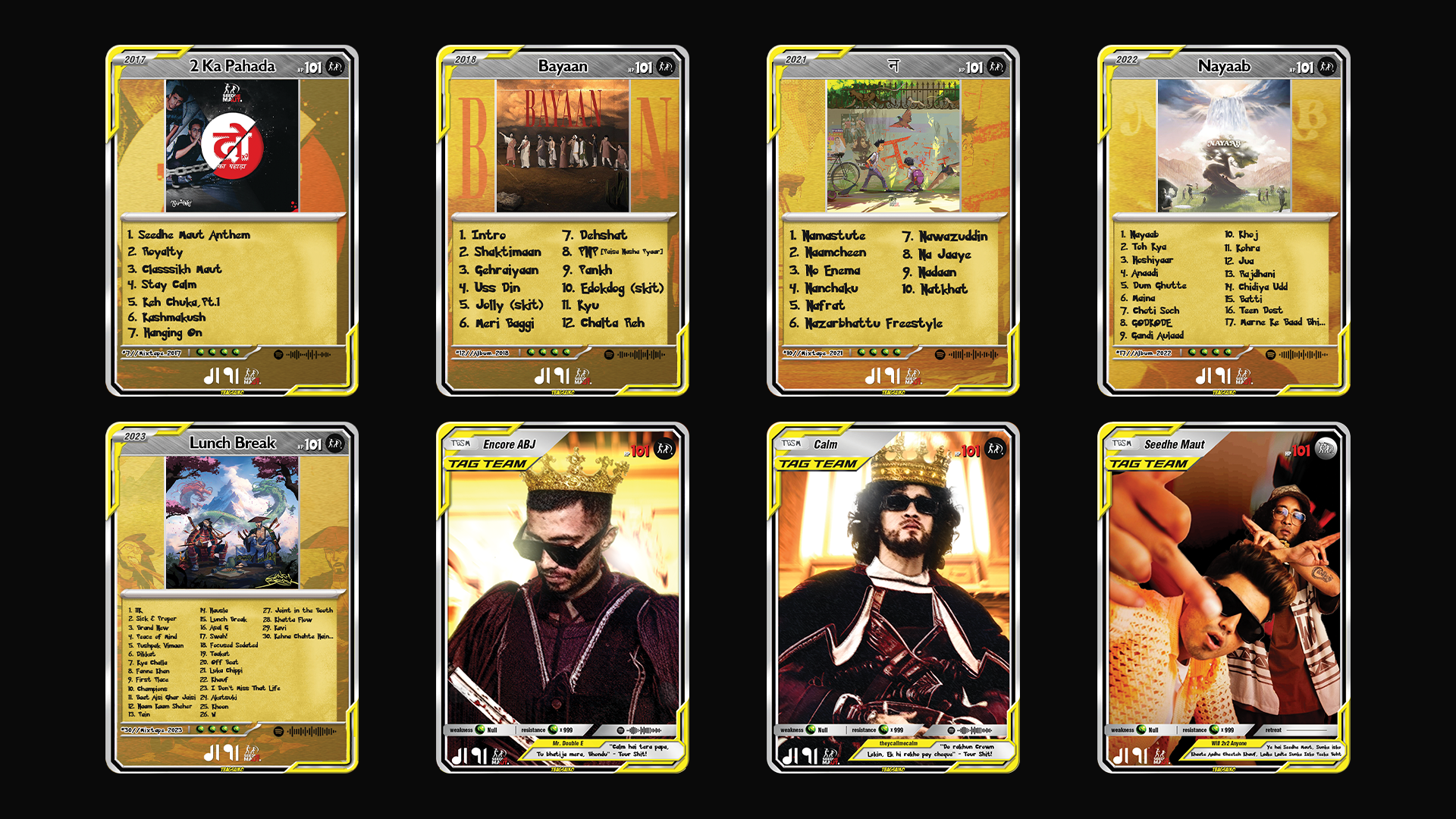 A fan-made card collection inspired by Seedhe Maut’s music, visuals, and energy. Each card is custom-designed with stylized artwork and details pulled from their albums and personalities.